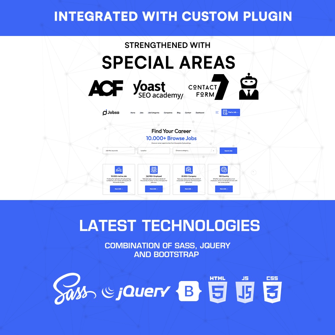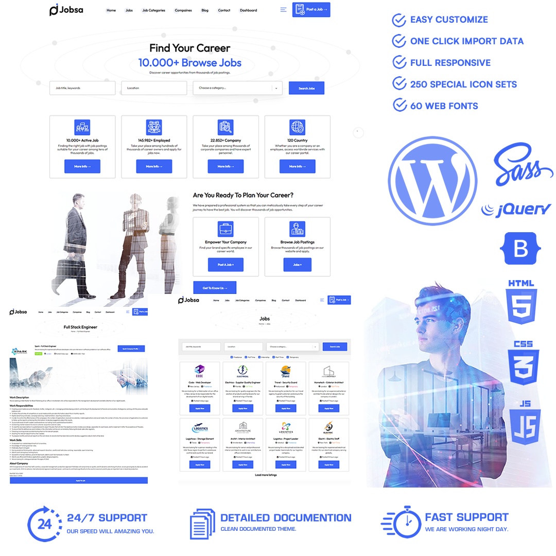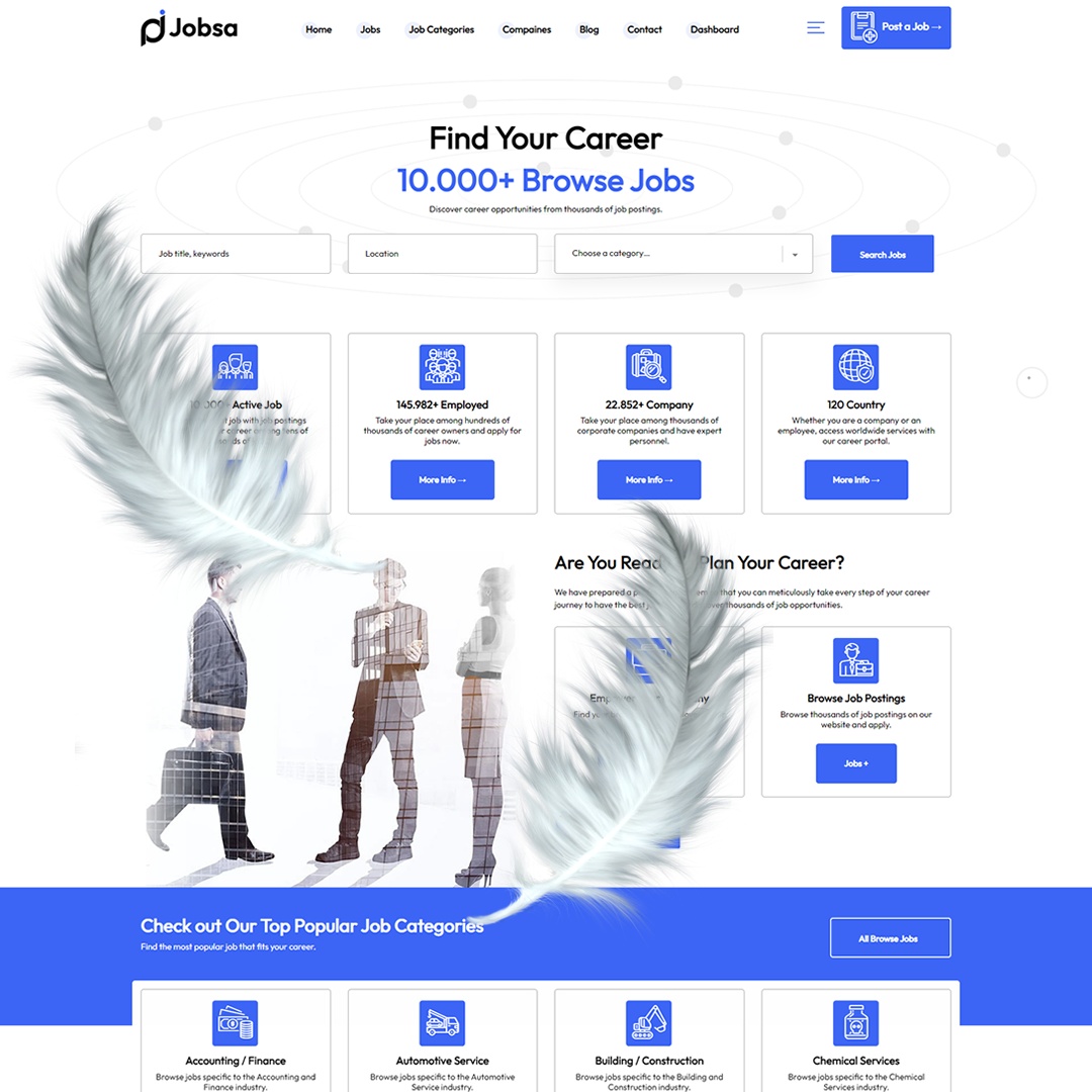 Jobsa WordPress Themeis a wordpress theme with special software that will appeal to every user with a magnificent system developed forCareer portalandJob portal.If you want to set up a Career and Job Portal system, you will have the features and design that will make a global impact with our Jobsa wordpress theme.