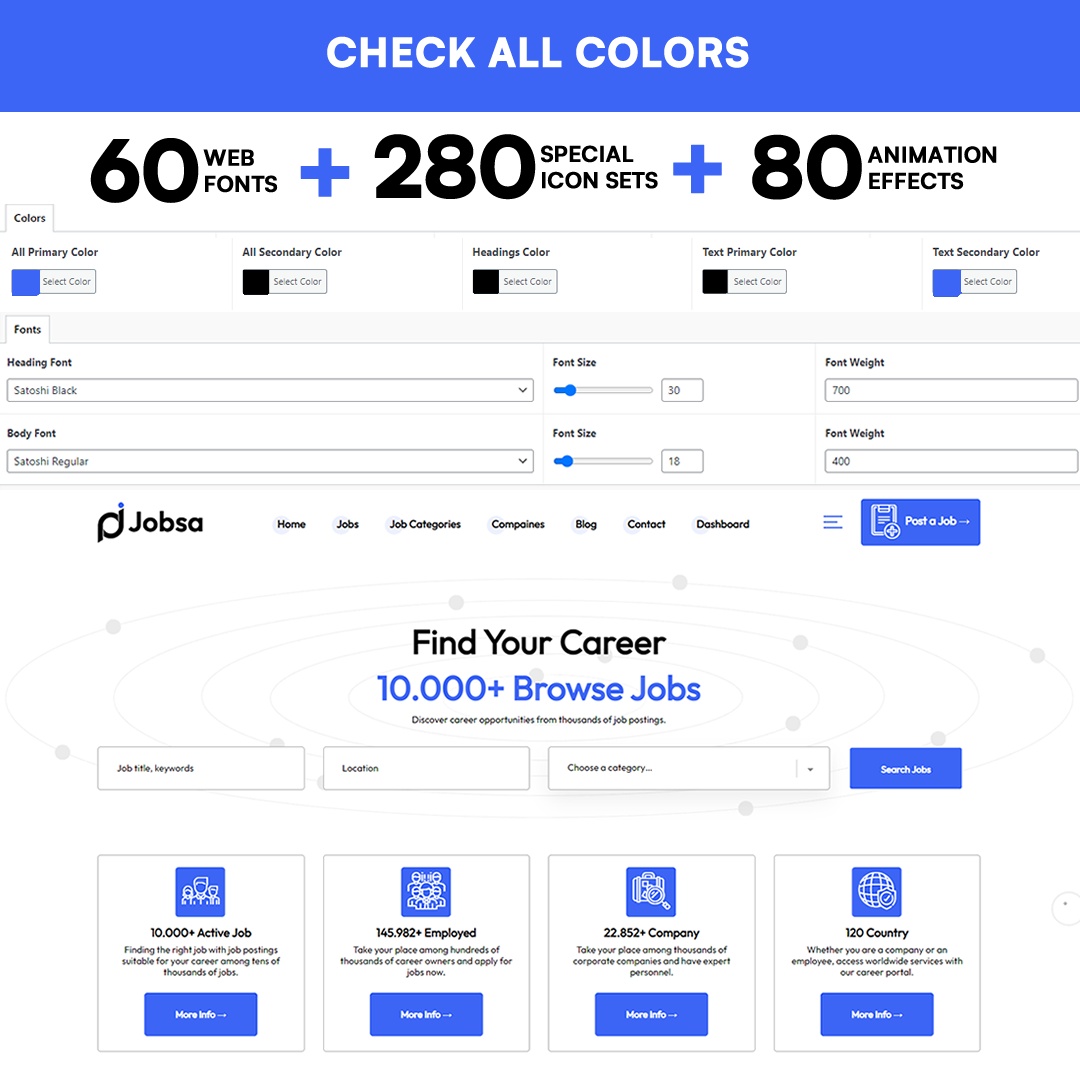 With this template, which we have coded and designed for a long time, you will integrate your career portal very quickly and easily. With the one-click import option, you will import all the data instantly and you will be able to customize very quickly from the tabs on the quick theme pages. From the theme settings, you will be able to quickly change the structure of your corporate identity, such as logo, tone, color, font, point, information fields and all your corporate features within a minute.