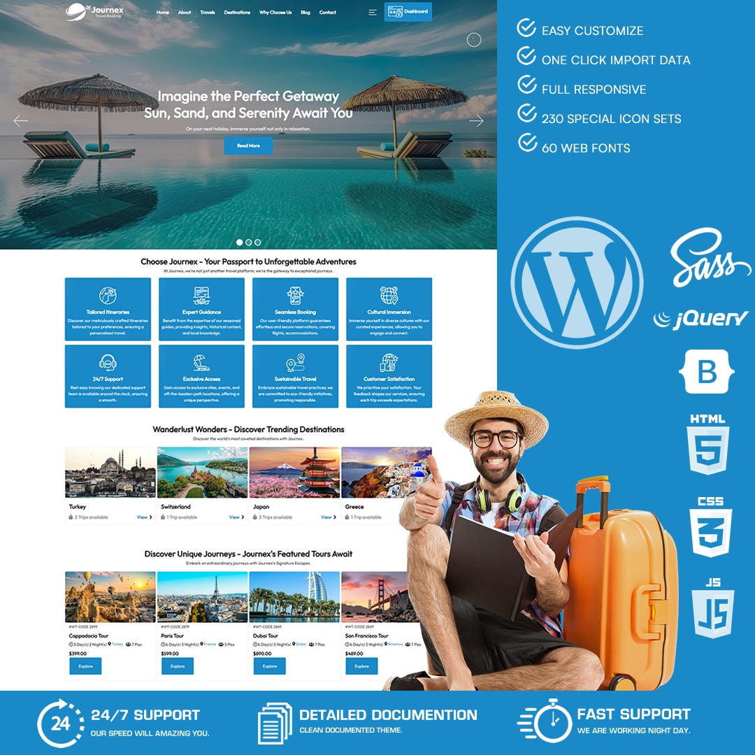 Journex WordPress Theme: The Ultimate Solution for Travel Agencies and Hotel BookingJournex WordPress Theme is an innovative and dynamic platform designed for travel agencies, hotel booking, tour services, and all-encompassing travel reservations. This cutting-edge theme is meticulously crafted, specifically tailored to meet the diverse and ever-evolving needs of the travel industry. Journex empowers users to unlock a multitude of functions and features, allowing for a seamless and efficient experience in managing bookings, creating unique travel experiences, and customizing every aspect of a journey.