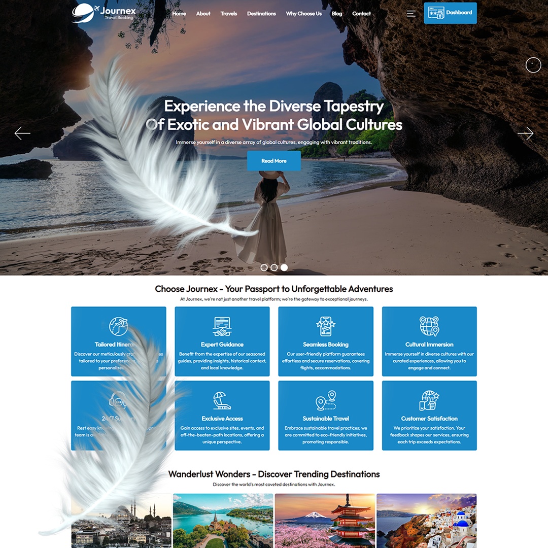 With these advanced features, Journex stands as an all-encompassing solution, empowering travel agencies and businesses to offer enhanced and personalized travel experiences, streamlining operations, and ensuring a user-friendly interface for both businesses and their clients. This comprehensive theme provides an immersive and seamless online experience, culminating in a robust and efficient online travel agency platform.